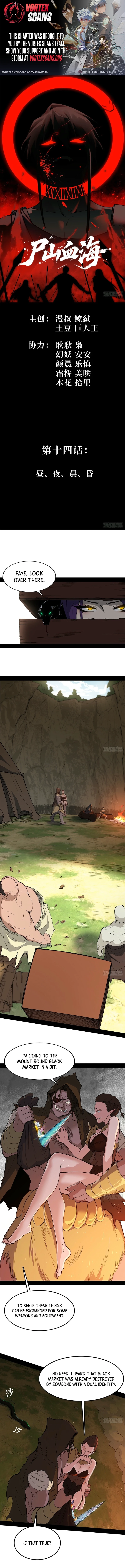 A Mountain of Corpses, A Sea of Blood Chapter 14 includes 13 comic pages in the main reading order. Published November 16, 2025 and updated February 22, 2026.